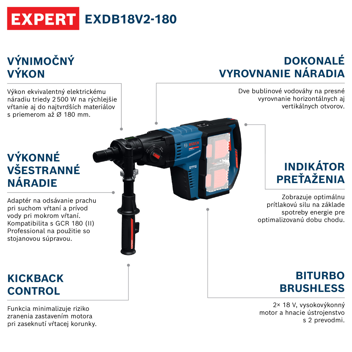 EXPERT EXDB18V2-180 je výkonná vŕtačka na diamantové vŕtacie korunky, ktorá pracuje na dva 18 V akumulátory. Poskytne výkon ekvivalentný elektrickému náradiu triedy 2 500 W na rýchlejšie vŕtanie aj do najtvrdších materiálov s priemerom až Ø180 mm. Technológia BITURBO Brushless a 2× 18 V akumulátory, vysokovýkonný motor a 2 prevody sú špeciálne navrhnuté na skvelé využívanie extrémneho výkonu akumulátorov EXPERT. Pokročilé funkcie ochrany používateľa, ako napr. KickBack Control, minimalizujú riziko zranenia zastavením motora, keď sa zasekne vŕtacia korunka. Vŕtačka je vybavená aj funkciami Drop Control a odomykacím (Lock-off) mechanizmom na vyššiu mieru ochrany počas prepravy. Toto všestranné náradie na vysoké zaťaženie je ideálne na súpravou riadené a ručné jadrové vŕtanie, aj mokré a suché vŕtanie na zabezpečenie spoľahlivého používania pri všetkých druhoch materiálov. Je kompatibilné s GCR 180 (II) Professional na prácu so súpravou. Táto výkonná vŕtačka na diamantové vŕtacie korunky pracuje na našej platforme Bosch Professional 18V a zároveň poskytuje vynikajúci výkon.