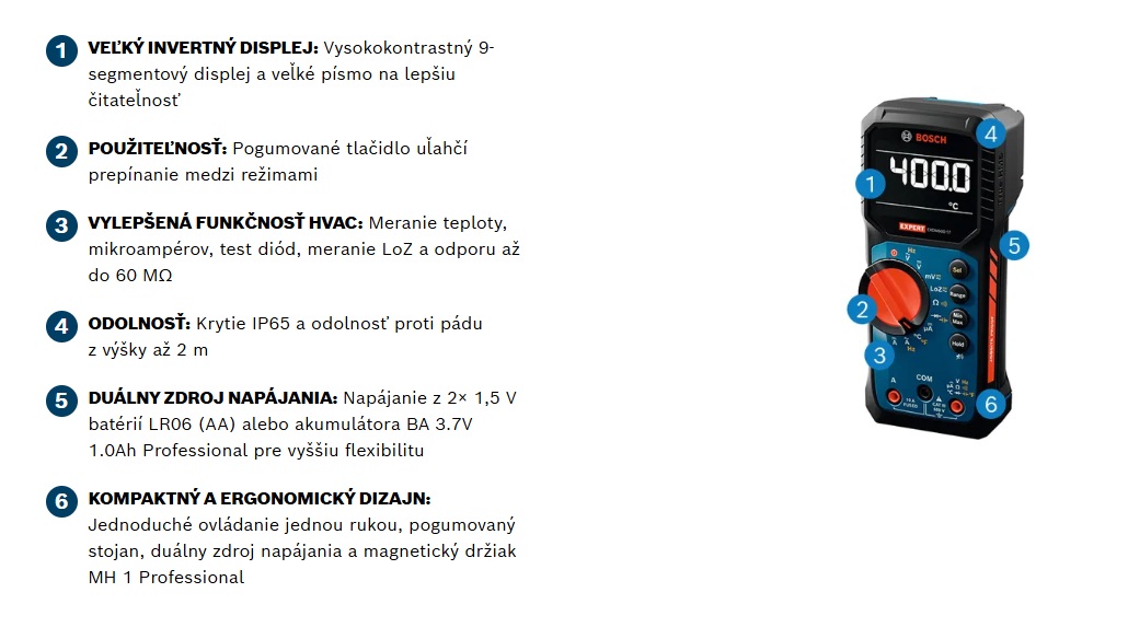 Digitálny multimeter EXPERT je kompatibilný s profesionálnym akumulátorom BA 3.7V 1.0Ah; MH 1 Professional, MS 90 Professional a teplotnou sondou typu K.