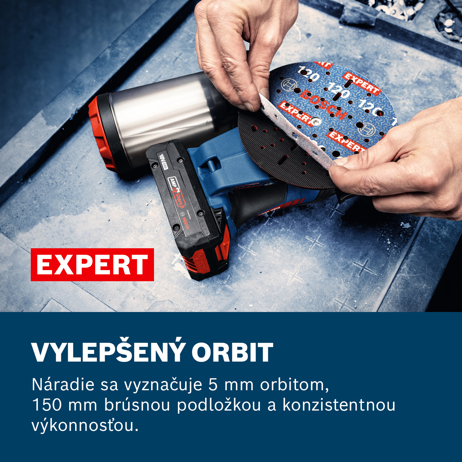EXPERT EXEX18V-150-5 je ideálne náradie na brúsenie dreva, farby a laku, ako aj na priebežné brúsenie a jemné brúsenie povrchov. Kompatibilita so systémom Bosch Professional 18 V a alianciou výrobcov akumulátorov AMPShare.