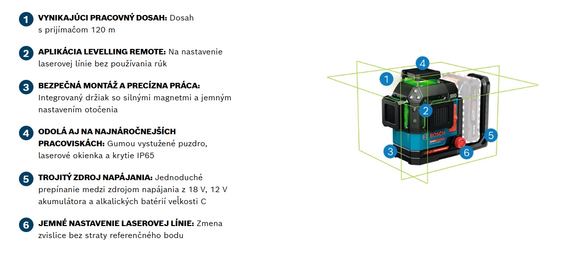EXPERT EXLL18V-120-33CG poskytne profesionálom spoľahlivú presnosť v najnáročnejších pracovných podmienkach. Zabezpečí veľký pracovný dosah až 120 m. Tri zdroje napájania umožnia prepínať medzi napájaním z 18 V/12 V akumulátora a z alkalických batérií veľkosti C, aby sa predišlo prestojom. Tento líniový laser má pogumované puzdro a zapustené laserové okienka s krytím IP65 čím chránia prístroj pred prachom, vodou či nárazmi. Je vybavený podsvietenou rohovou klávesnicou na individuálny výber laserových línií a integrovaný držiak so silnými magnetmi na bezpečnú montáž. Jemné nastavenie umožní zmeniť zvislú líniu bez straty referenčného bodu.