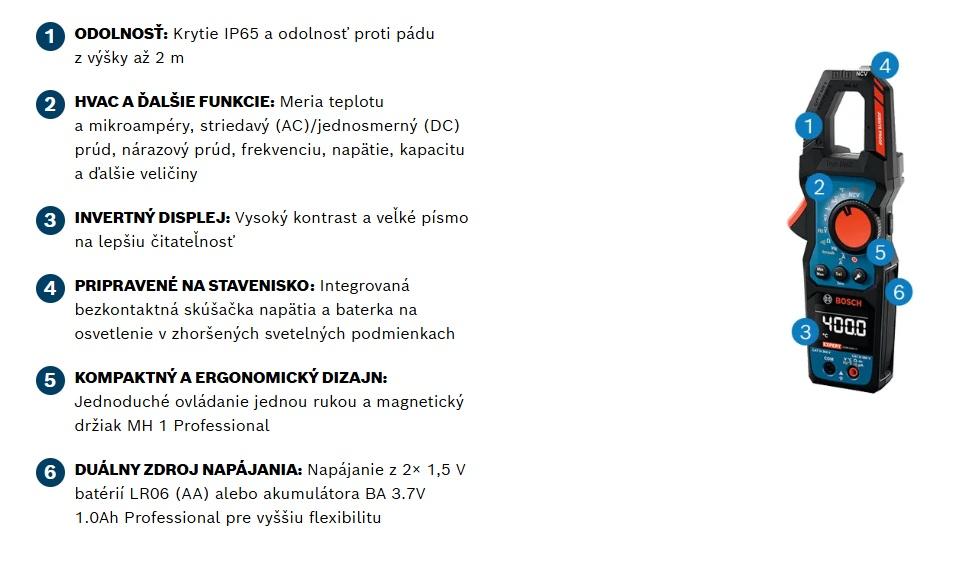 Kliešťový ampérmeter EXPERT meria striedavý a jednosmerný prúd až do 600 A a napätie do 600 V AC/DC. Kompatibilita s lítium-iónovým akumulátorom BA 3.7V 1.0Ah A Professional; magnetickým držiakom MH 1 Professional, testovacími káblami MS 90 Professional a teplotnou sondou typu K Professional.