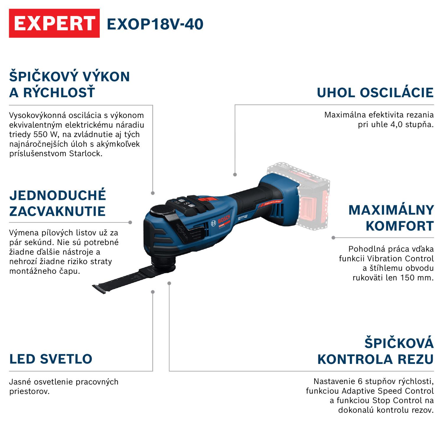 EXPERT EXOP18V-40 je 18 V oscilačné multifunkčné náradie s vynikajúcim výkonom navrhnuté na zvládnutie aj tých najnáročnejších prác s akýmkoľvek kompatibilným príslušenstvom Starlock – vrátane StarlockMax. Výkonný bezuhlíkový motor poskytne vysokovýkonnú osciláciu s výkonom ekvivalentným elektrickému náradiu triedy 550 W. Uhol oscilácie je 4,0° na maximálnu efektivitu rezania. Jednoduchý upevňovací mechanizmus umožňuje rýchlu beznástrojovú výmenu pílového listu a nehrozí riziko straty upevňovacieho čapu. Funkcia Vibration Control účinne znižuje škodlivé vibrácie a štíhla rukoväť s obvodom iba 150 mm je navrhnutá na maximálny pracovný komfort.