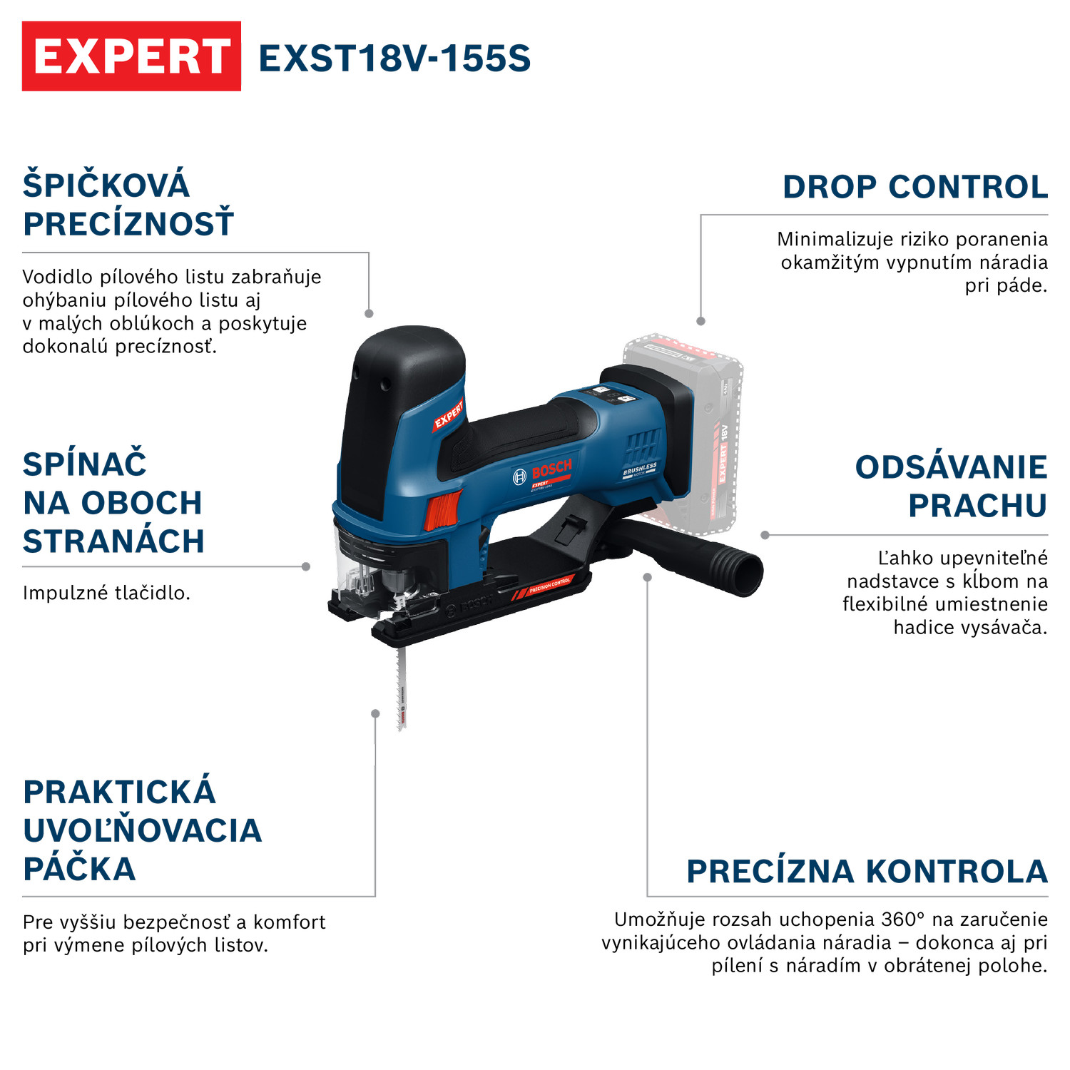 18 V priamočiara píla EXPERT EXST18V-155S s nosovou rukoväťou zabezpečí vynikajúcu precíznosť. Vodidlo pílového listu zabraňuje ohýbaniu pílového listu aj v malých oblúkoch a poskytuje dokonalú presnosť. Intuitívny ergonomický dizajn umožňuje rozsah uchopenia 360° na zaručenie vynikajúceho ovládania náradia – dokonca aj pri brúsení s prevráteným náradím. Priamočiara píla má pokročilú ochranu používateľa: Funkcia Drop Control minimalizuje riziko zranenia tým, že pri páde sa náradie okamžite vypne. Zabezpečí spoľahlivé odsávanie prachu s ľahko upevniteľnými adaptérmi s kĺbom na flexibilné umiestnenie hadice vysávača a praktickým vypínačom Zap/Vyp na najlepšie pracovné výsledky. Vďaka komfortnej ergonómii je obojstranný prepínač ľahko dosiahnuteľný na zablokovanie a odblokovanie, aj na pohodlné a plynulé nastavenie rýchlosti. Používateľské rozhranie HMI náradia umožní jednoduché nastavenie 6 stupňov rýchlosti, LED indikátor poskytne presnú indikáciu stavu náradia a akumulátora. EXPERT EXST18V-155S má praktickú uvoľňovaciu páčku na pokročilú ochranu a komfort pri výmene pílových listov.