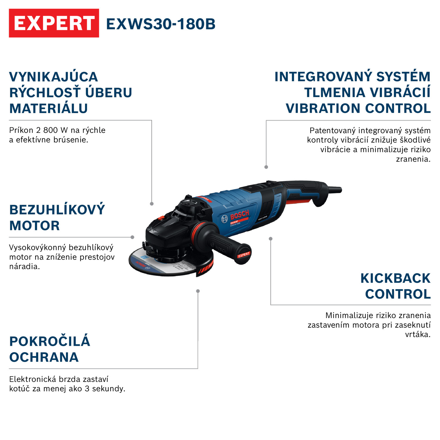 EXPERT EXWS30-180B poskytuje vysokú mieru úberu materiálu vďaka 2800 W bezuhlíkovému motoru, ktorý zároveň znižuje frekvenciu potreby údržby vďaka nižšiemu počtu opotrebovaných dielov a nevyužívaniu uhlíkov. Toto náradie poskytuje všestrannú bezpečnosť a praktickosť s elektronickou brzdou, ktorá zastaví kotúč za menej ako 3 sekundy, funkciou KickBack Control, ochranou proti opätovnému spusteniu a plynulým spustením. Práca bude vďaka integrovanému systému Vibration Control, ktorý minimalizuje vibrácie, menej únavná.