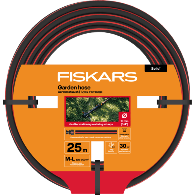 Záhradná hadica z radu Solid™ s dĺžkou 25 metrov a priemerom 19 mm (3/4”) je navrhnutá pre stredne veľké až veľké záhrady (veľkosť M-L). Vďaka svojmu širšiemu priemeru zabezpečuje maximálnu účinnosť zavlažovačov, pretože dokáže udržať optimálny tlak a vysoký prietok vody aj na dlhšie vzdialenosti. Tento model poskytuje spoľahlivý výkon a stabilitu, ktoré sú nevyhnutné pre efektívnu údržbu rozľahlejších trávnikov a výsadieb.
