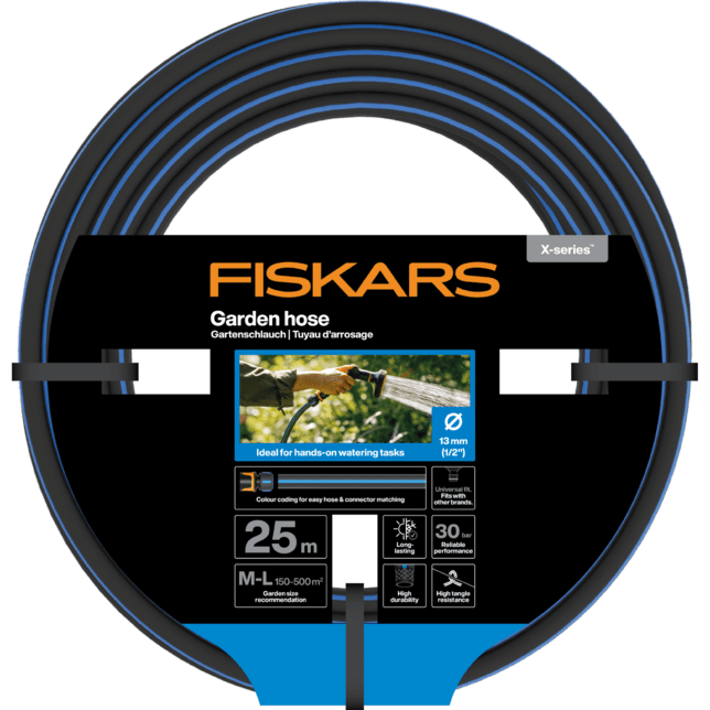 Záhradná hadica z prémiovej rady X-series™ s dĺžkou 25 metrov je ideálnym riešením pre stredne veľké až veľké záhrady (veľkosť M-L). Táto hadica bola vyvinutá s dôrazom na maximálnu odolnosť a užívateľský komfort, pričom jej špeciálna konštrukcia zabezpečuje vysokú odolnosť proti zamotaniu a krúteniu. Vďaka tomu je manuálne zavlažovanie rastlín alebo umývanie záhradného vybavenia plynulé a bez zbytočných prestojov.