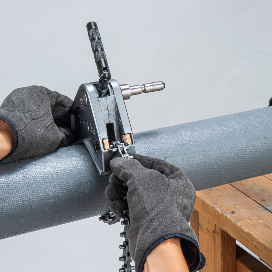 Vďaka reťazovému zveráku je píla pevne upevnená k obrobku čím sa zabezpečí presnejšie rezanie aj rúr s veľkým priemerom.