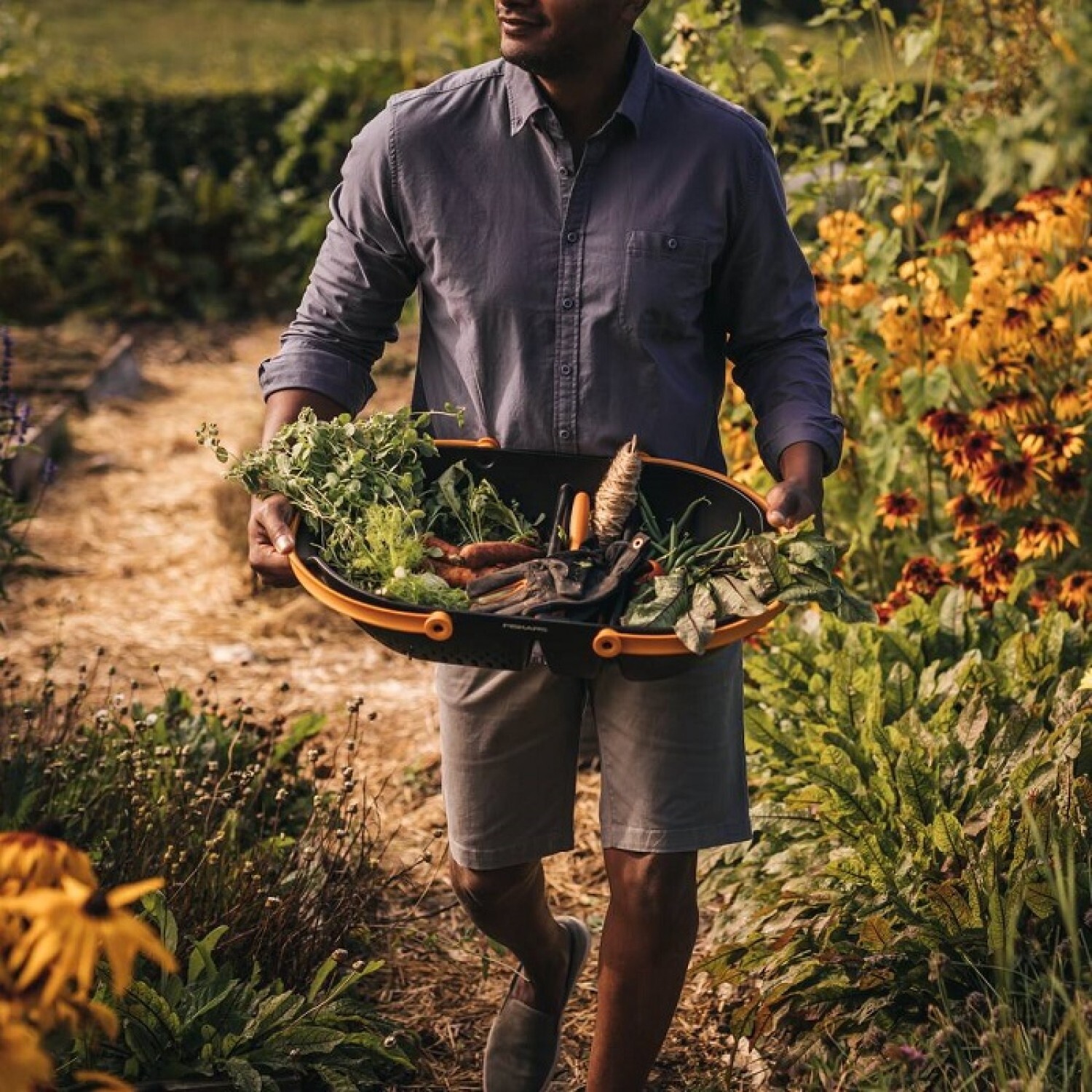 Zberací košík Fiskars® Plus predstavuje mimoriadne všestranné riešenie pre každého záhradkára. Je ideálnym pomocníkom nielen na zber a prepravu úrody, ale vďaka svojej unikátnej konštrukcii aj na jej priame čistenie. Košík je rozdelený na dve funkčné zóny: časť s dierovaným dnom, ktorá slúži ako cedidlo na pohodlné umývanie vypestovanej zeleniny či ovocia pod tečúcou vodou, a časť s plným dnom, ktorú môžete využiť na namáčanie úrody alebo prenos čistých plodov a záhradného náradia.