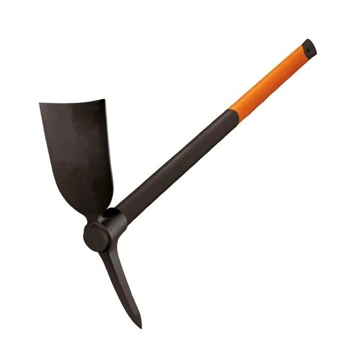 Záhradný krompáč v širokom vyhotovení je masívny nástroj navrhnutý pre maximálny výkon pri najnáročnejších zemných prácach. Pracovná časť je vykovaná z vysokokvalitnej karbónovej ocele, pričom obe jej strany sú precízne naostrené. Tento model kombinuje klasickú ostrú špičku, ideálnu na rozrušovanie extrémne tvrdej a kamenistej pôdy, s veľmi širokým plochým britom. Tento široký brit umožňuje veľký záber pri odkopávaní zeminy, hĺbení rýh alebo efektívnom presekávaní hrubých koreňov.