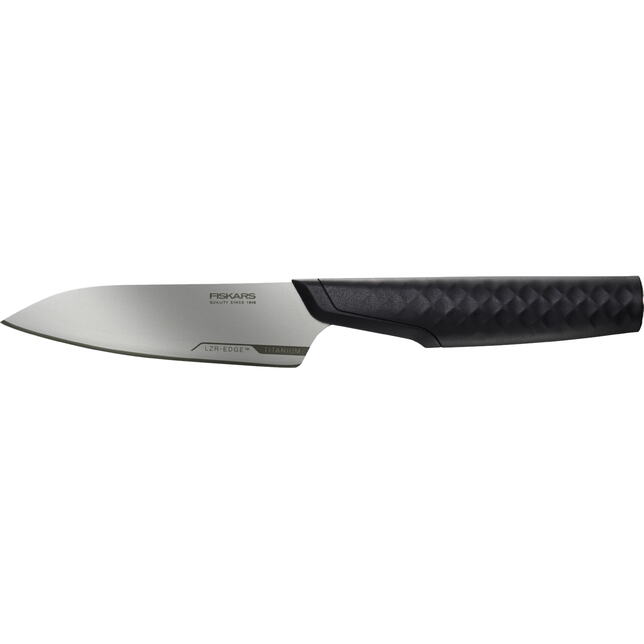 Nôž okrajovací s 10 cm čepeľou je ideálnym nástrojom na precízne lúpanie a krájanie menších surovín. Mimoriadne ľahká titánová čepeľ umožňuje vynikajúcu kontrolu nad každým rezom. Vďaka technológii LZR-EDGE™ si nôž zachováva svoje rezné vlastnosti štyrikrát dlhšie než štandardné nože. Ergonomická rukoväť s 3D textúrou je navrhnutá tak, aby sa výborne držala v ruke. Na brúsenie je najvhodnejší keramický kameň Whetstone.