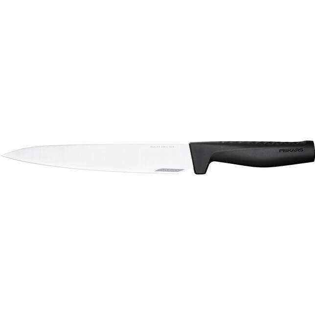 Tento nôž sa vyznačuje rovnou, dlhou čepeľou s hladkým ostrím, čo ho robí ideálnym nástrojom na krájanie pečeného mäsa. Silná nerezová oceľová planžeta dodáva čepeli vysokú odolnosť. Ostrie vyrobené revolučnou technológiou LZR-EDGE™ udržuje nôž ostrý 4x dlhšie v porovnaní so štandardnými nožmi. Jedinečný 3D vzor na ergonomicky tvarovanom držadle zabezpečuje perfektné držanie.