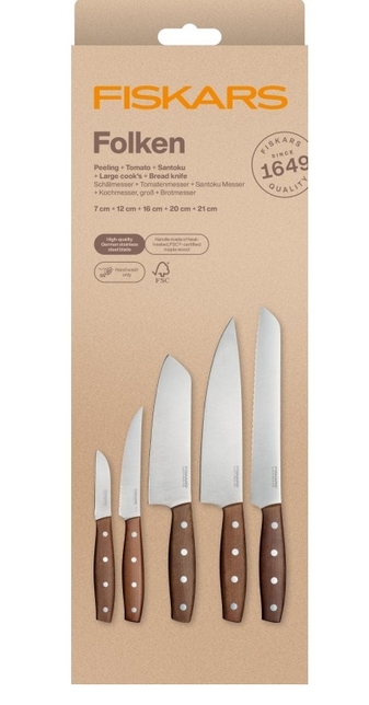 Kompletná súprava piatich nožov obsahuje nôž na chlieb a pečivo, veľký kuchársky nôž, nôž Santoku, raňajkový nôž a lúpací nôž. Táto zostava pokryje všetky potreby v kuchyni od krájania pečiva a zeleniny až po lúpanie drobného ovocia. Všetky nože majú špičkovú nemeckú oceľovú čepeľ a rukoväť z javorového dreva s certifikátom FSC®.