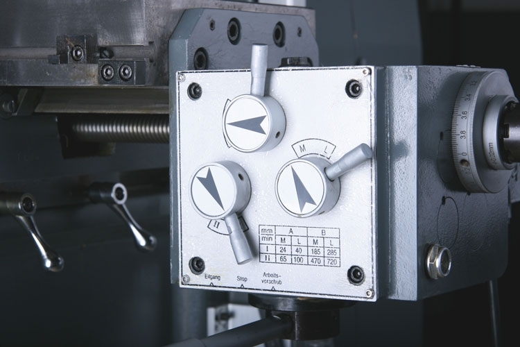 - Posuv pinoly pomocou troch páčkových rukovätí (vŕtanie) alebo pomocou ručného kolesa jemného posuvu